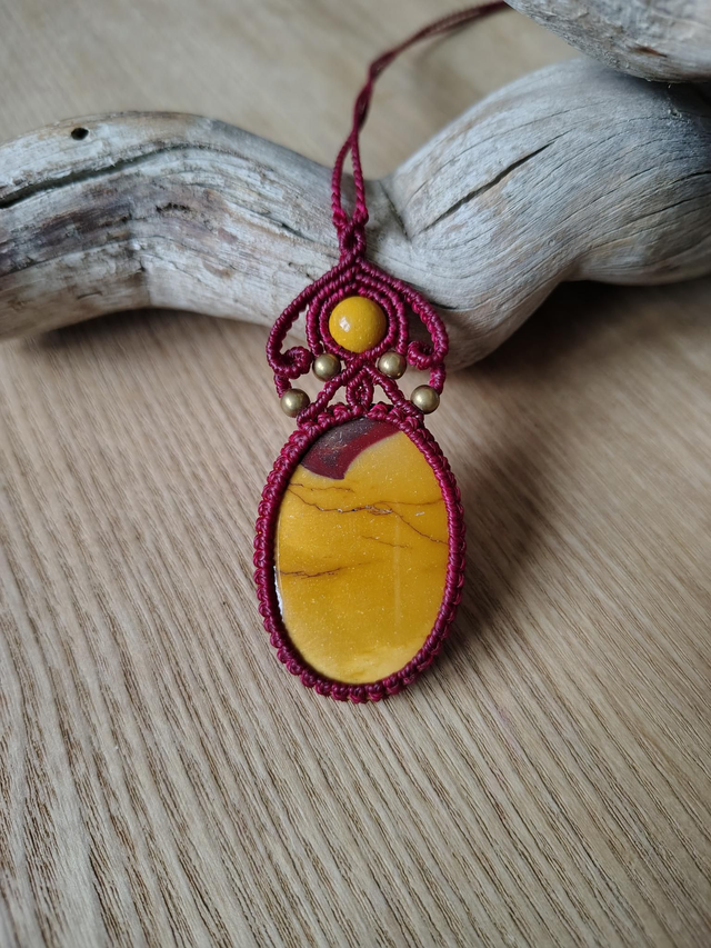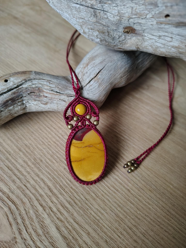 Proposé avec un fil de couleur bordeaux et des pierres naturelles aux nuances jaune et rouge. Entre terre ocre et fil noué, ce bijou accompagne celles et ceux qui avancent avec confiance, guidés par leur élan intérieur.